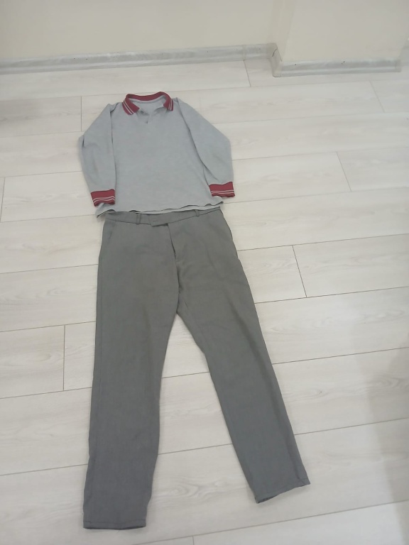 Üst: Açık gri, uzun kollu bir kazak. Yakası ve bilek manşetlerinde bordo renkli çizgili detaylı polo yaka tarzında okul forması